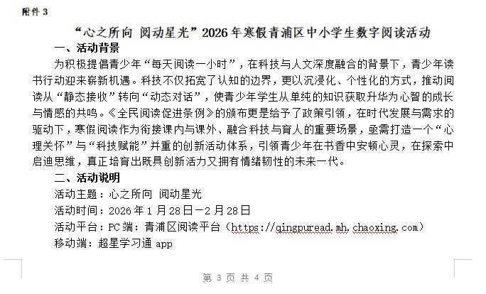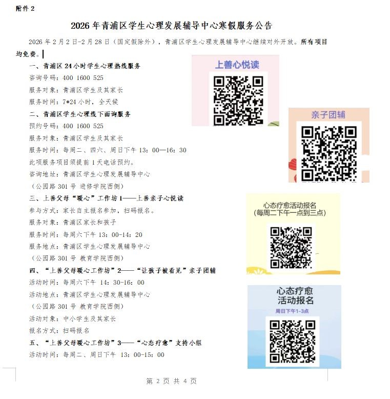 在一个学期的忙碌之后,寒假的脚步悄然临近,在此,学校希望各位能认真阅读《2026年中小学生寒假安全提示》、《青浦区学生心理发展辅导中心寒假服务公告》等内容。